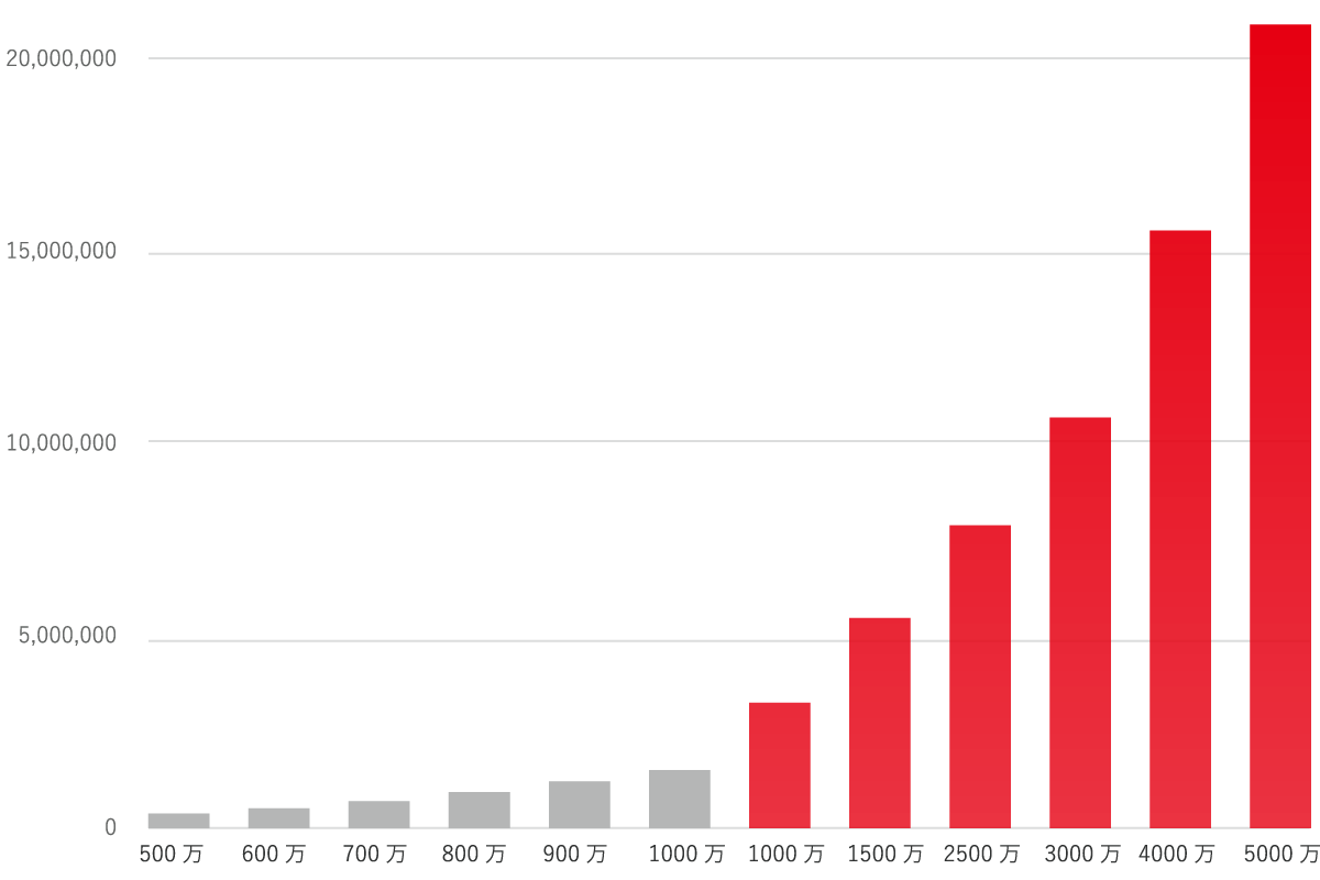 医師としての収入が上がれば上がるほど、収入の半分以上を税金として納めることになります。個人の最大所得税率が 45%であり、さらに住民税が10%かかる場合、合計の税率は55%にも上ります。これは医師の方々が高所得を得るにつ れ、その収入の大部分が税金として徴収されることを意味しています。 下記は年収別の納税金額を表したグラフです。